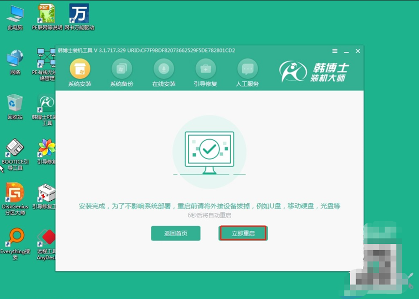 5.當(dāng)前系統(tǒng)正在安裝和部署中,為了確保順利完成,建議您此時(shí)不要進(jìn)行其他操作。一旦安裝完成,您將看到提示信息,點(diǎn)擊“立即重啟”即可繼續(xù)。