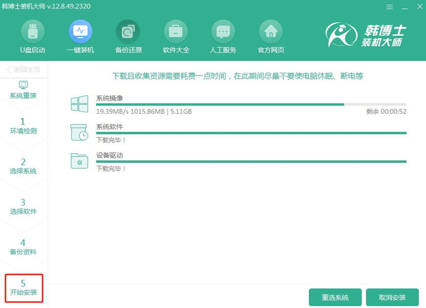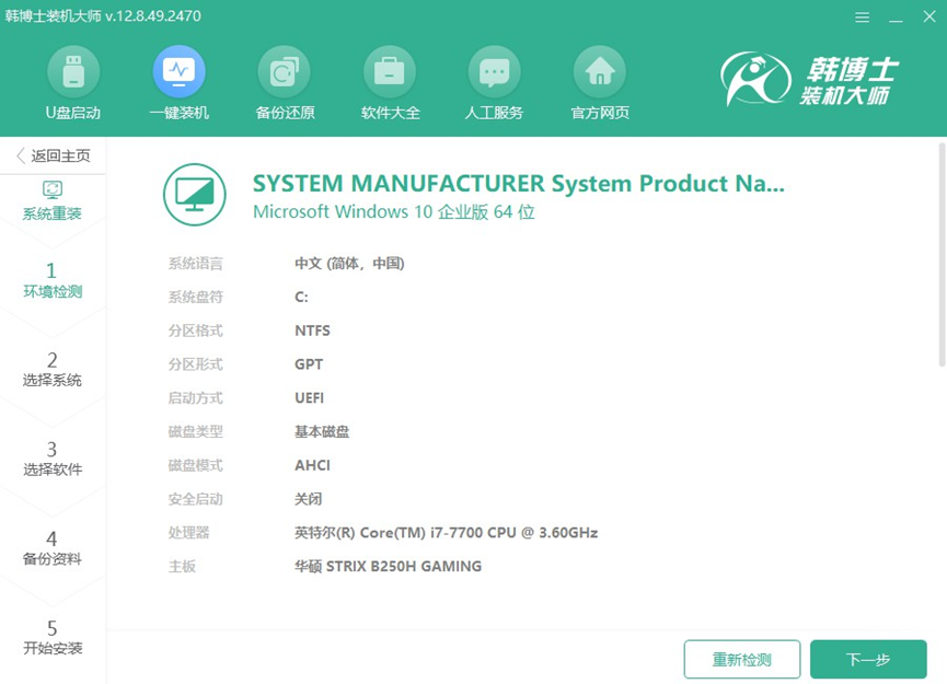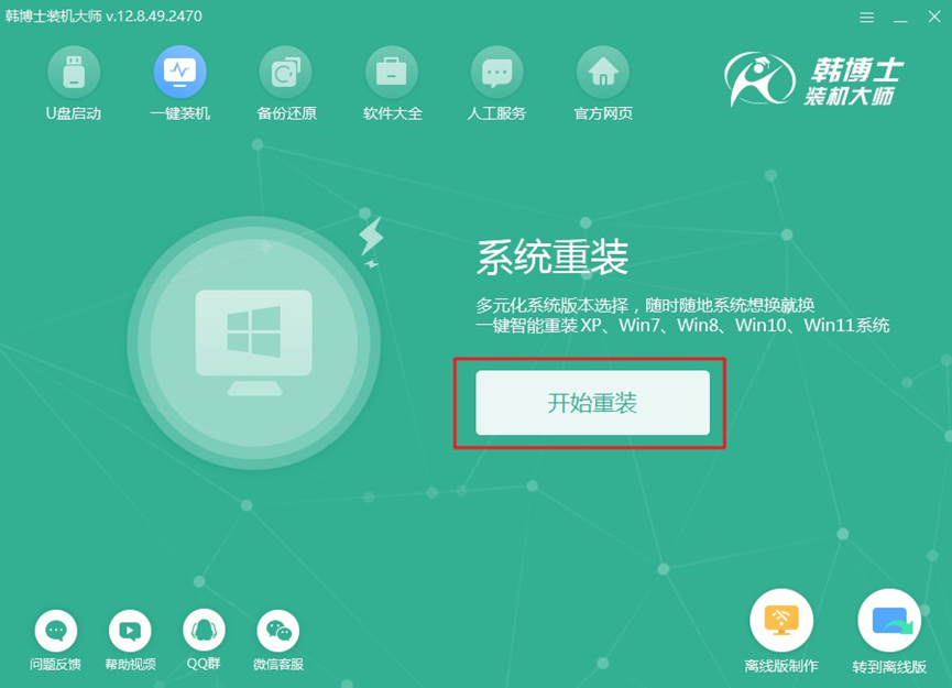 1.首先,訪問韓博士官網(wǎng),下載并安裝“韓博士裝機(jī)大師”軟件,安裝完成后啟動(dòng),點(diǎn)擊“開始重裝”按鍵,按提示進(jìn)行操作。