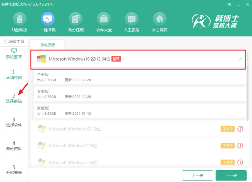 3.進(jìn)入“選擇系統(tǒng)”界面后,系統(tǒng)會(huì)展示多個(gè)win10鏡像版本,您可以根據(jù)自己的需求選中合適的版本,點(diǎn)擊“下一步”,開始下載鏡像文件到本地電腦。